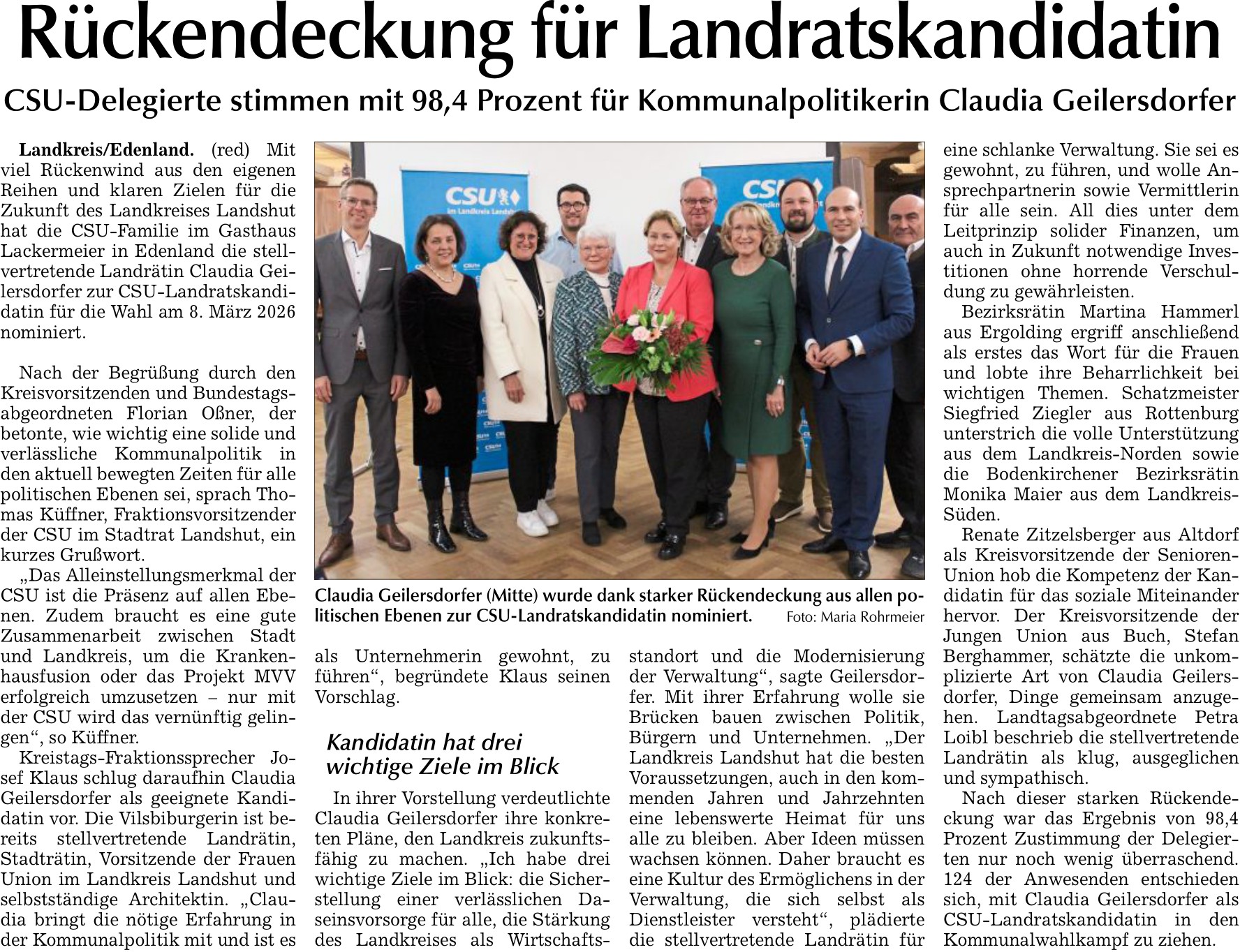 CSU-Delegierte stimmen mit 98,4 Prozent für Kommunalpolitikerin Claudia Geilersdorfer